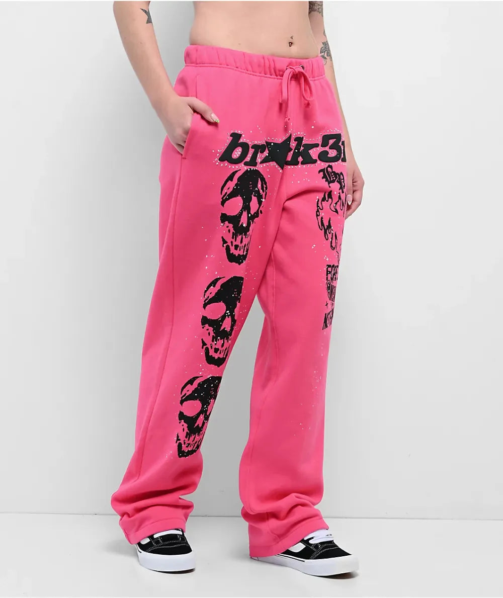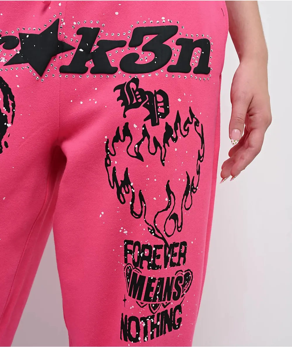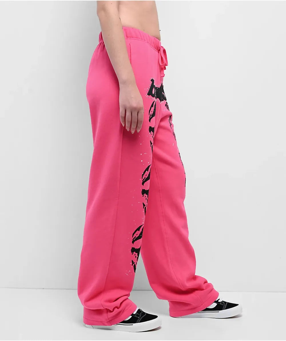 Broken Promises Faceless Rhinestone Pink Wide Leg Sweatpants