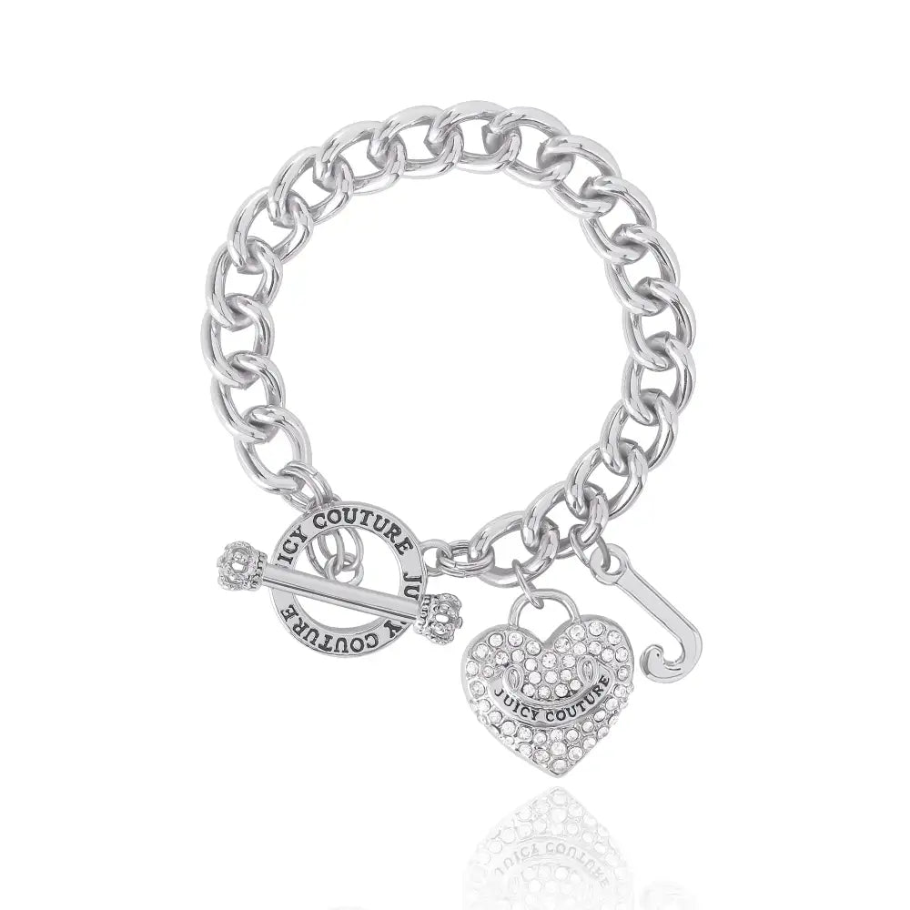 Elevate your jewelry collection with this iconic Juicy Couture Toggle Bracelet, featuring a sparkling crystal heart charm and signature "J" logo charm. Crafted with a luxurious chain and easy-to-wear toggle clasp, this bracelet combines sophistication and playful charm. Perfect for adding a touch of glamour to your everyday or evening look.