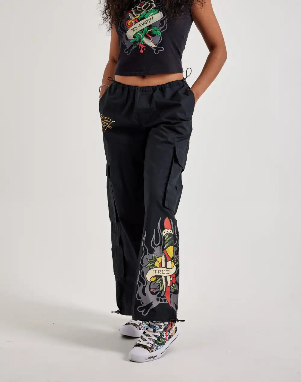 The Ed Hardy Dagger Skull Cargo Pants blend bold tattoo-inspired graphics with utility-driven style for a statement-making look. Featuring edgy skull and dagger artwork, multiple cargo pockets, and a relaxed fit, these pants deliver the perfect mix of streetwear and rebellion.