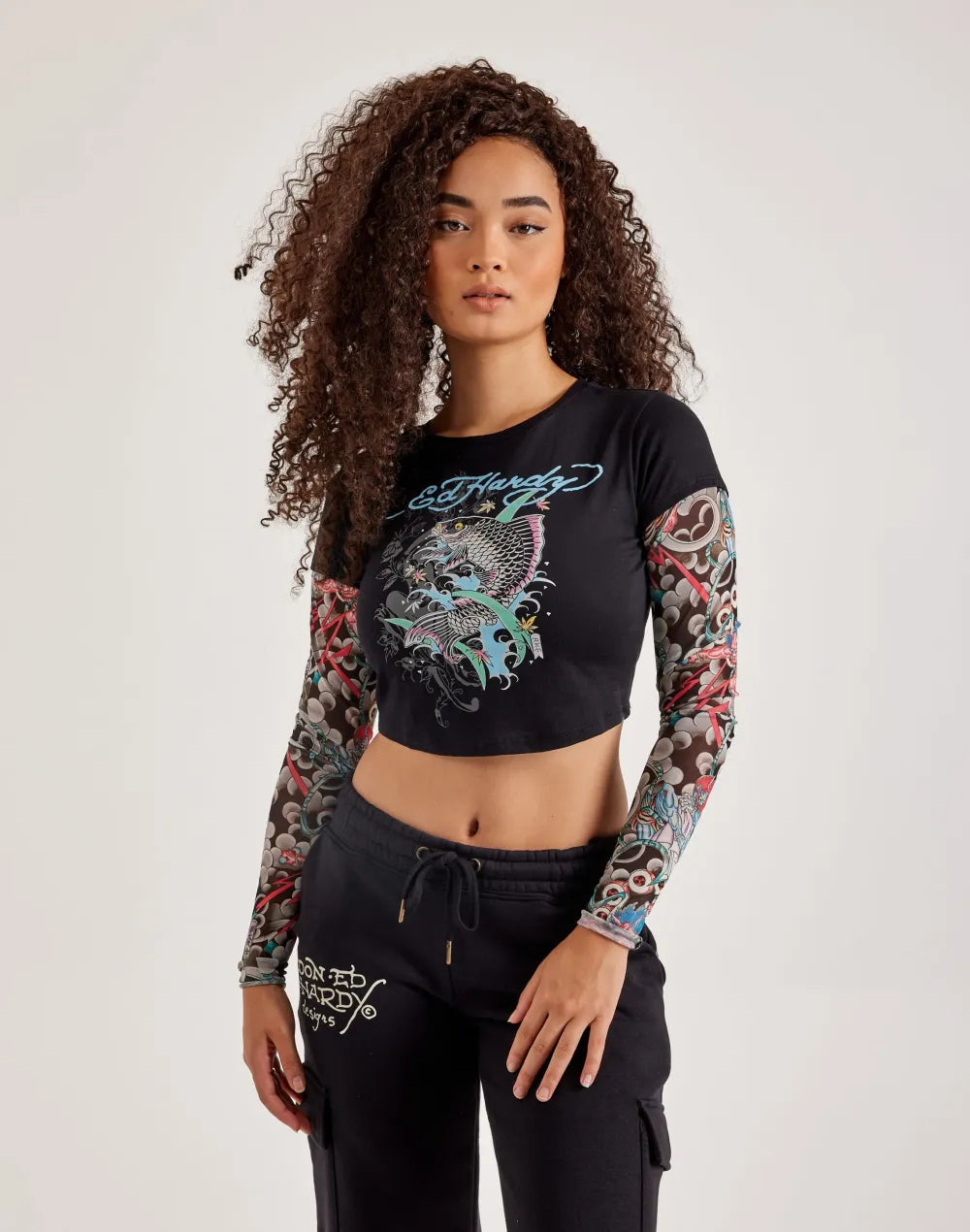 In signature Ed Hardy style, this women's long-sleeve top displays colorful tattoo graphics on the sleeves. It's crafted from soft, lightweight mesh for comfortable wear in any season.