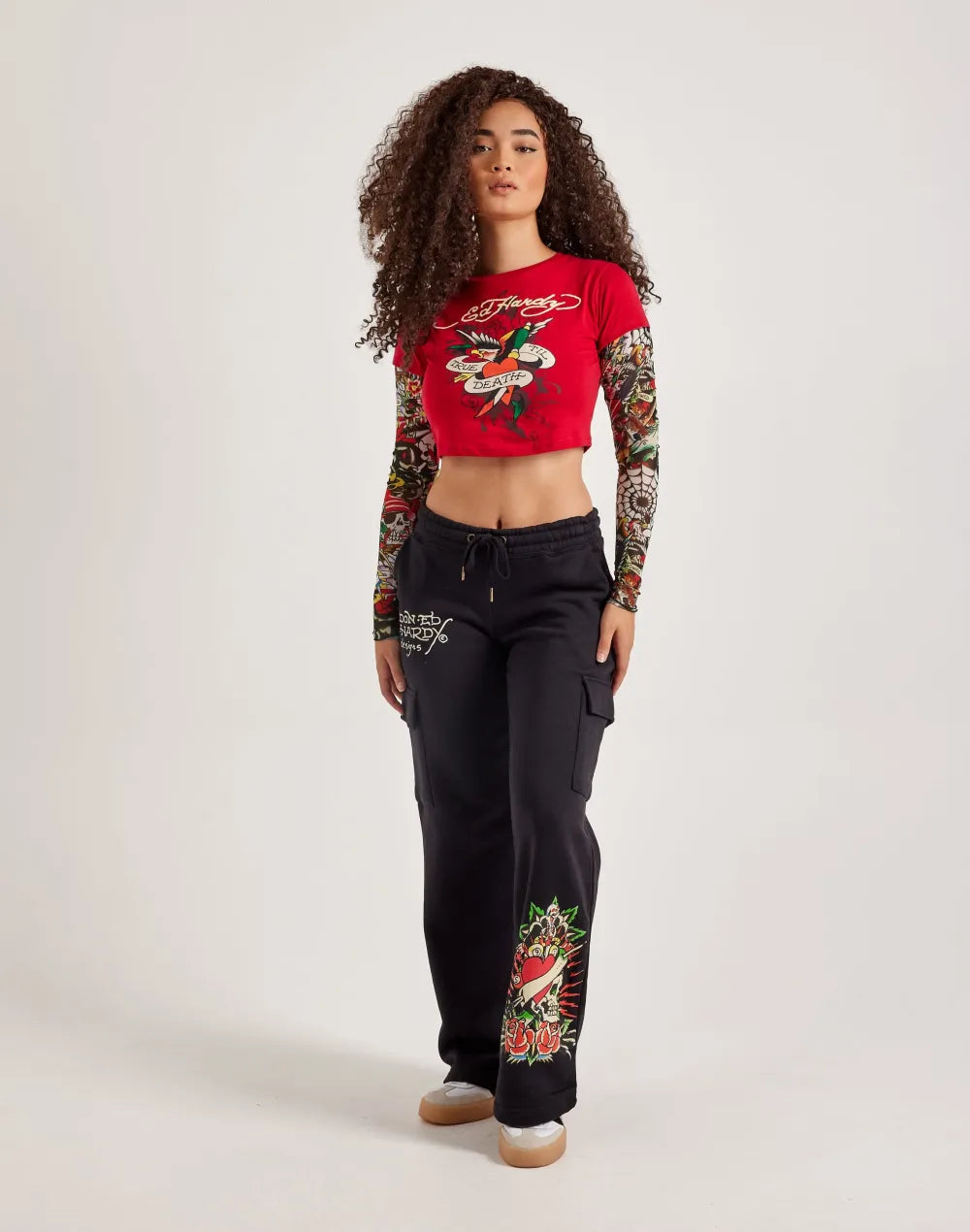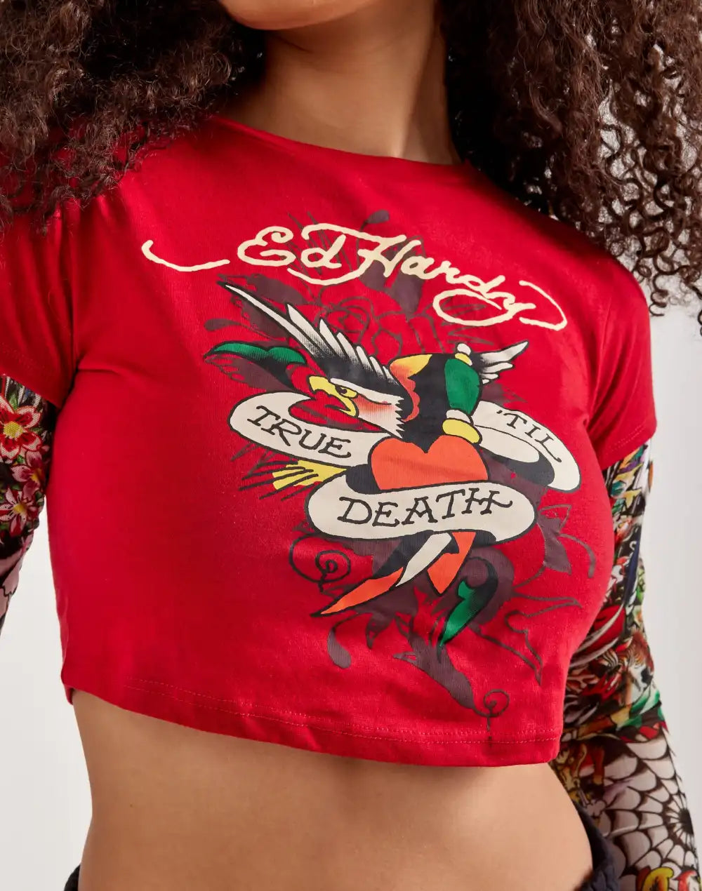 In signature Ed Hardy style, this women's long-sleeve top displays colorful tattoo graphics on the sleeves. It's crafted from soft, lightweight mesh for comfortable wear in any season.