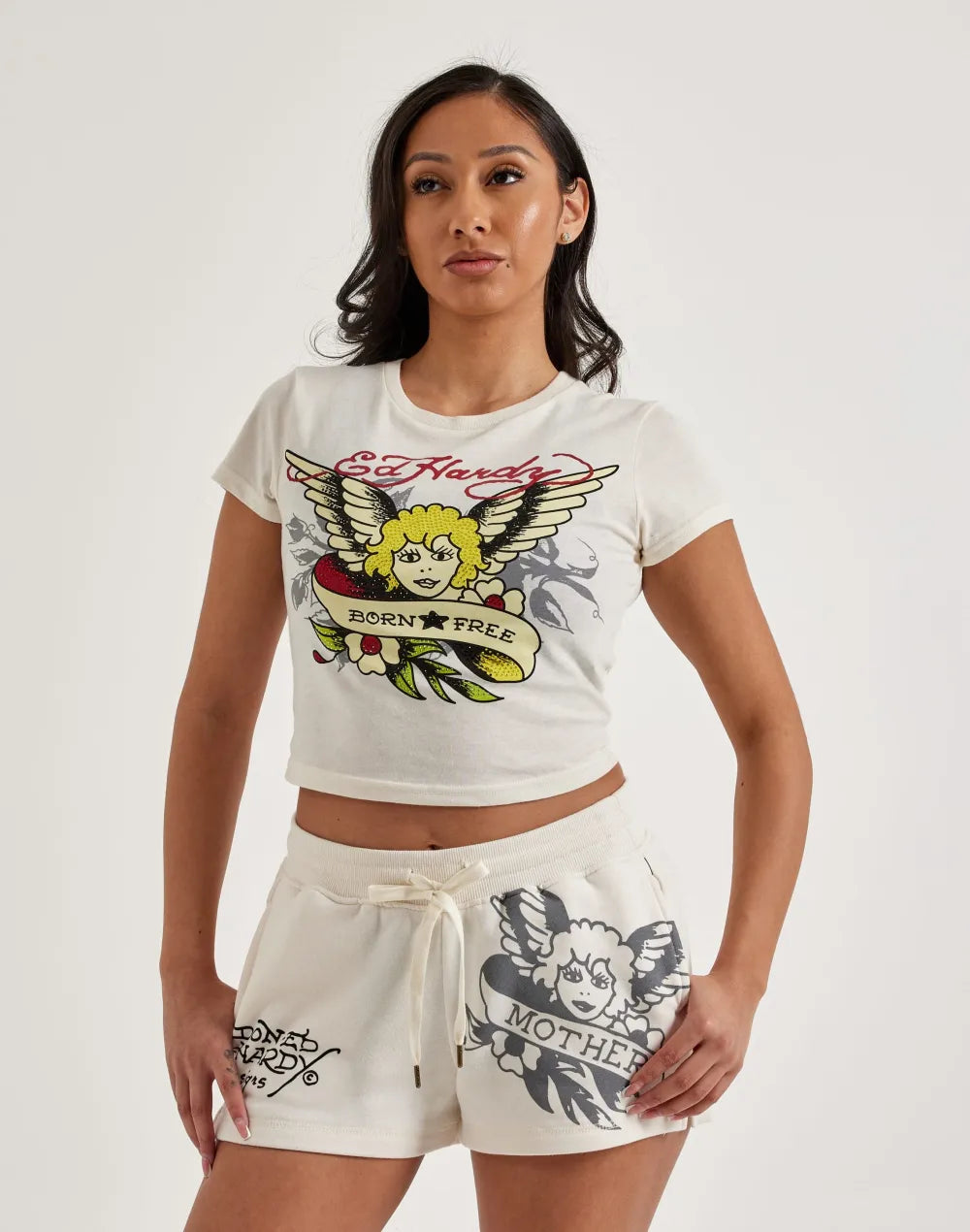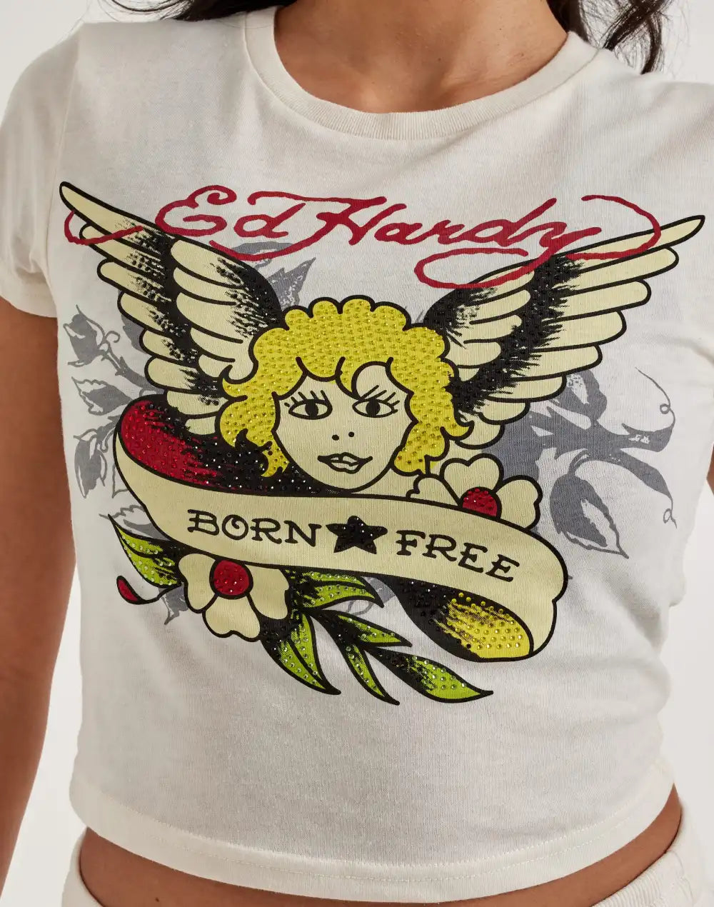 The Ed Hardy Rhinestone Cherub Baby Tee features a rhinestone-studded, tattoo-inspired graphic that stands out. This women's T-shirt has a cropped fit and is crafted from lightweight cotton for comfort.