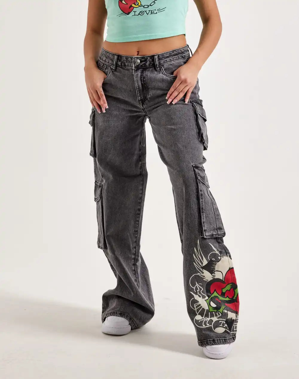 The Ed Hardy Sacred Heart Cargo Jeans blend bold style with practical design, featuring intricate tattoo-inspired graphics and spacious cargo pockets. These jeans offer a relaxed fit, perfect for adding an edgy vibe to any outfit.