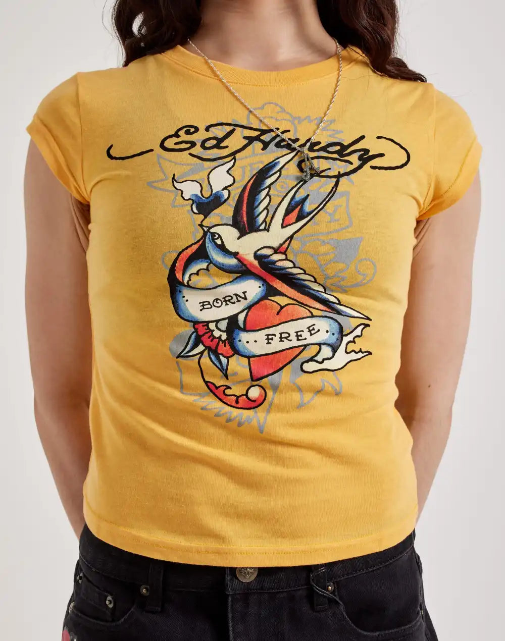 The Ed Hardy Swallow Cap Sleeve Tee features a tattoo-inspired graphic that stands out. This women's T-shirt has a slim fit and is crafted from lightweight cotton for comfort.