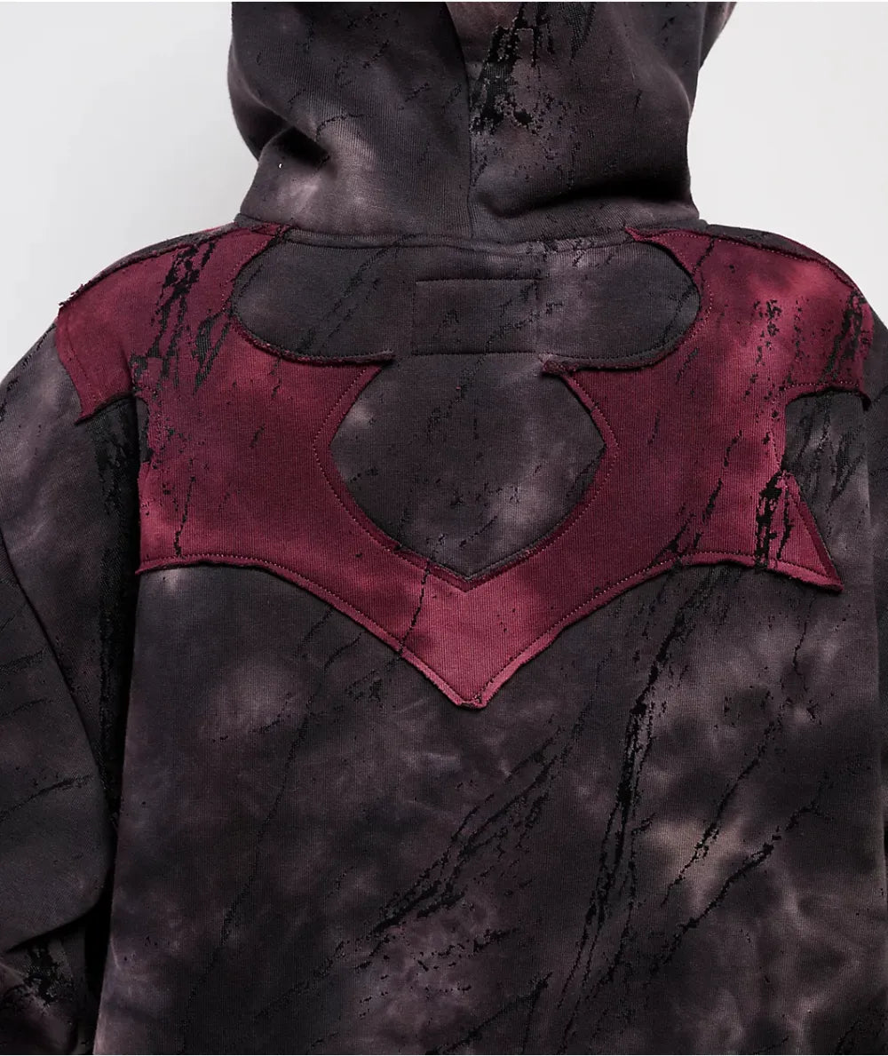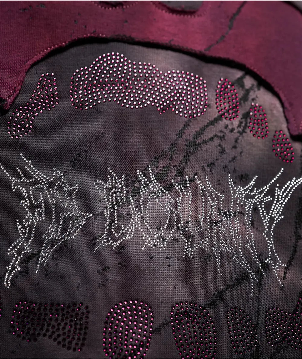 Add bold mall goth style to any outfit with the Rhinestone Skull hoodie from FB County. The alternative pullover has a black wash colorway with a washed purple Skull design embroidered on the front. Purple Rhinestones form the shape of teeth while silver Rhinestones spell out cybersigilism branding for eye-catching sparkle.
