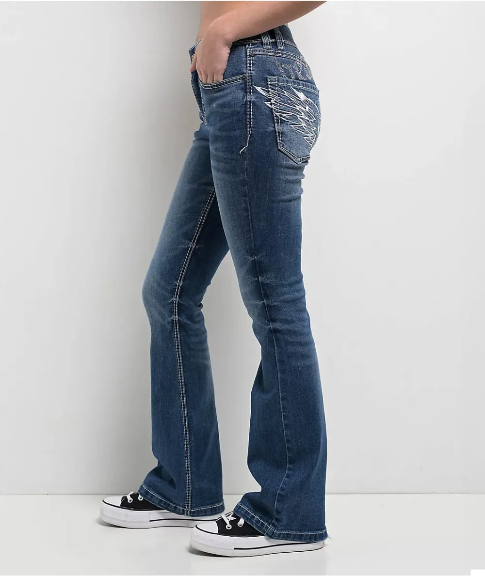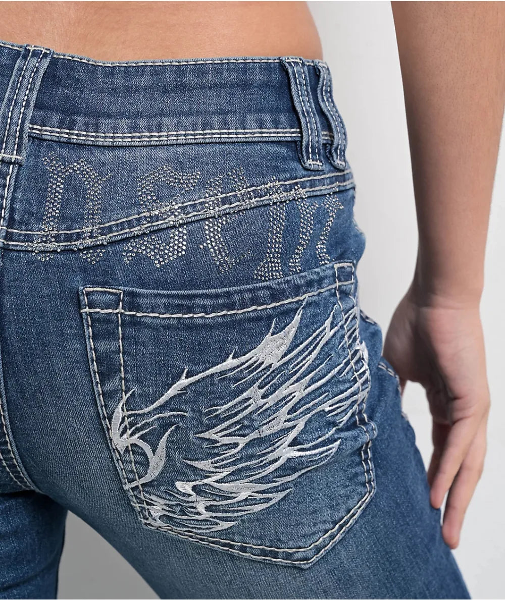 Ninth Hall welcomes the Alyssia jeans in a classic blue washed tone and a bootcut silhouette for a flattering slim-fit. Drawing attention with rhinestone detailing on the back reading "Heaven sent", the seat pockets employ luxe embroidery of feathered wings while the rest of the pants are framed by white contrast stitching for a sleek Y2K touch. The stylish bootcut bottoms are finished with a standard five-pocket layout, button fly, and debossed hardware.