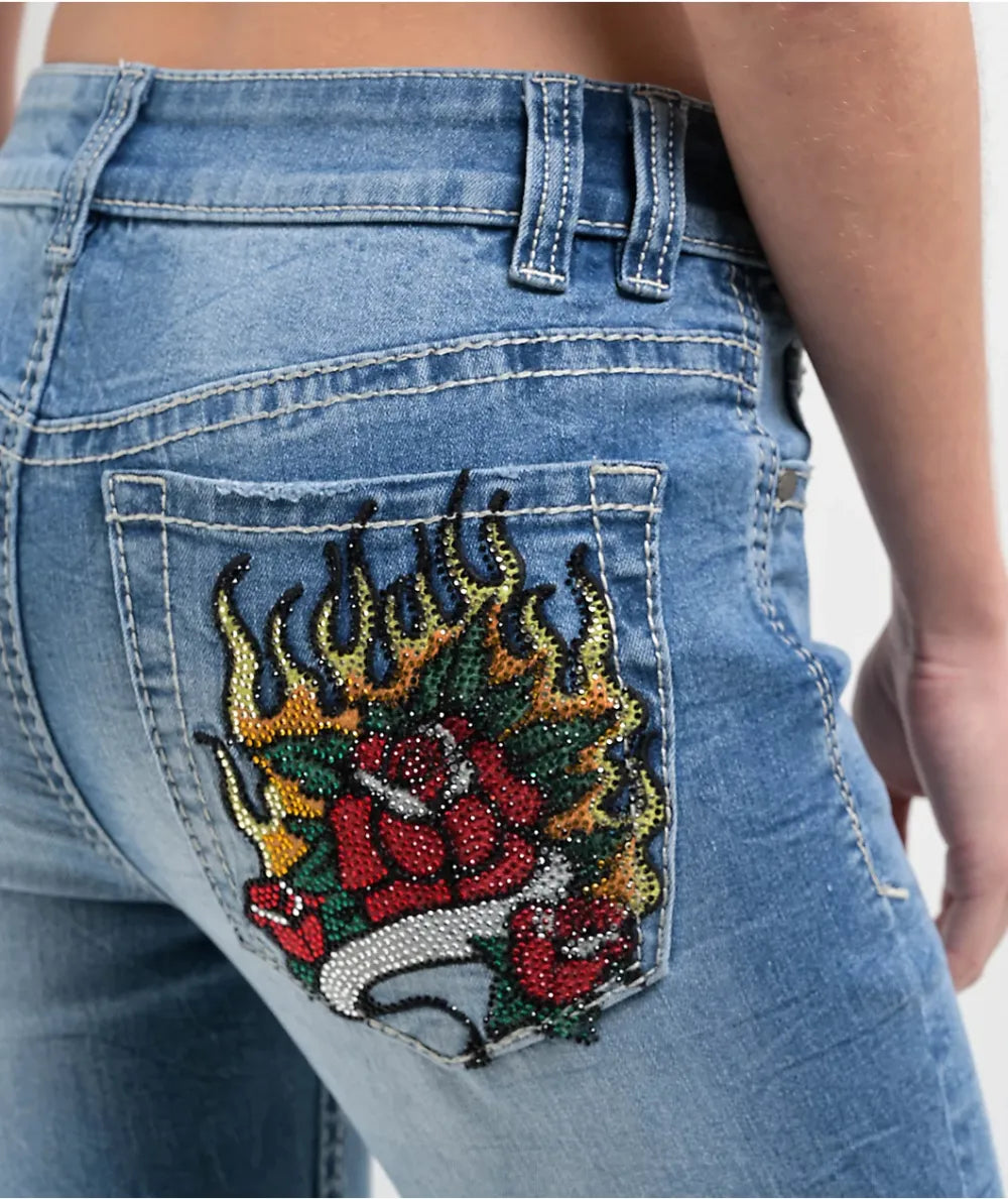 Ninth Hall Alyssia Rose Rhinestone Blue Wash Bootcut Jeans