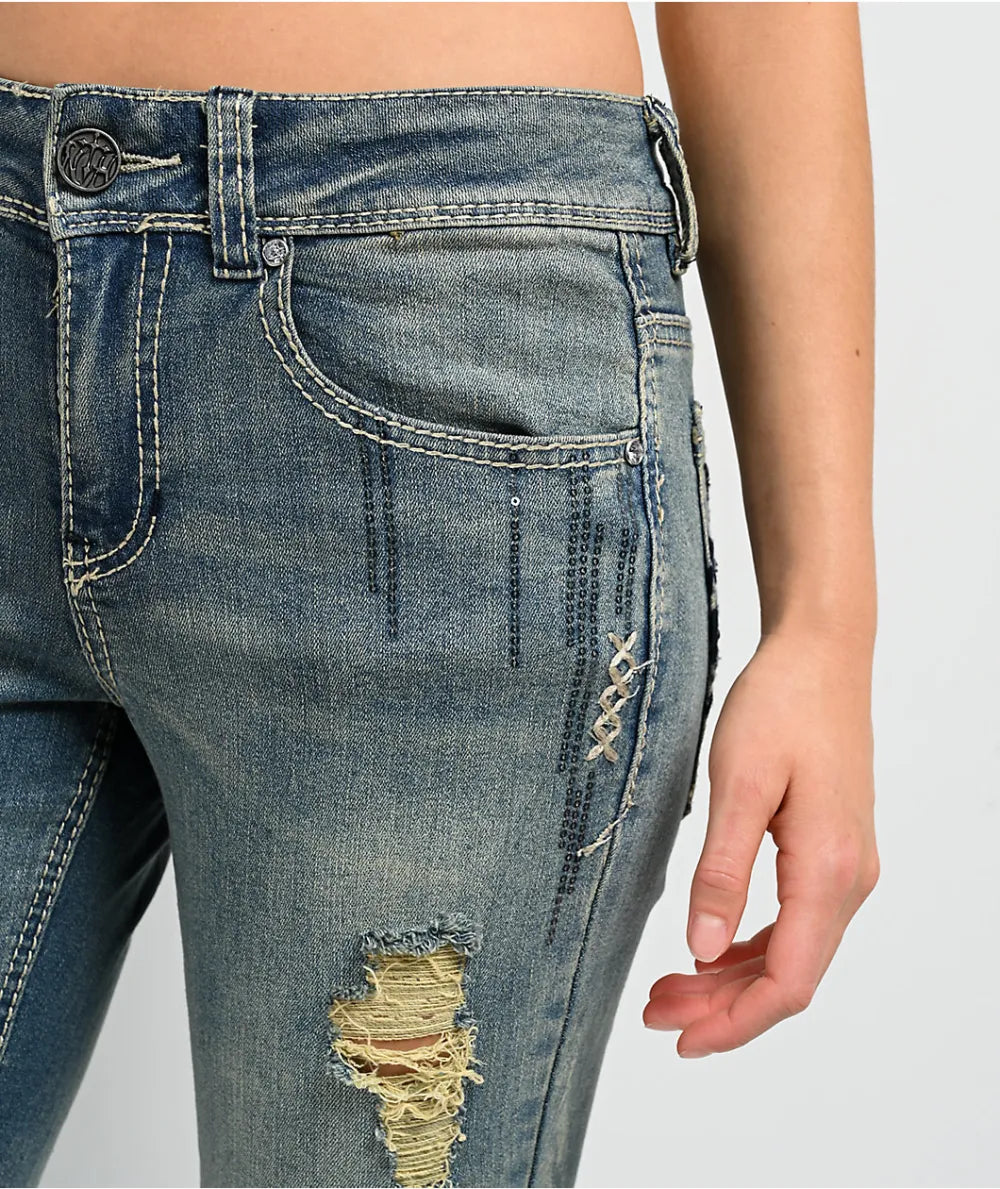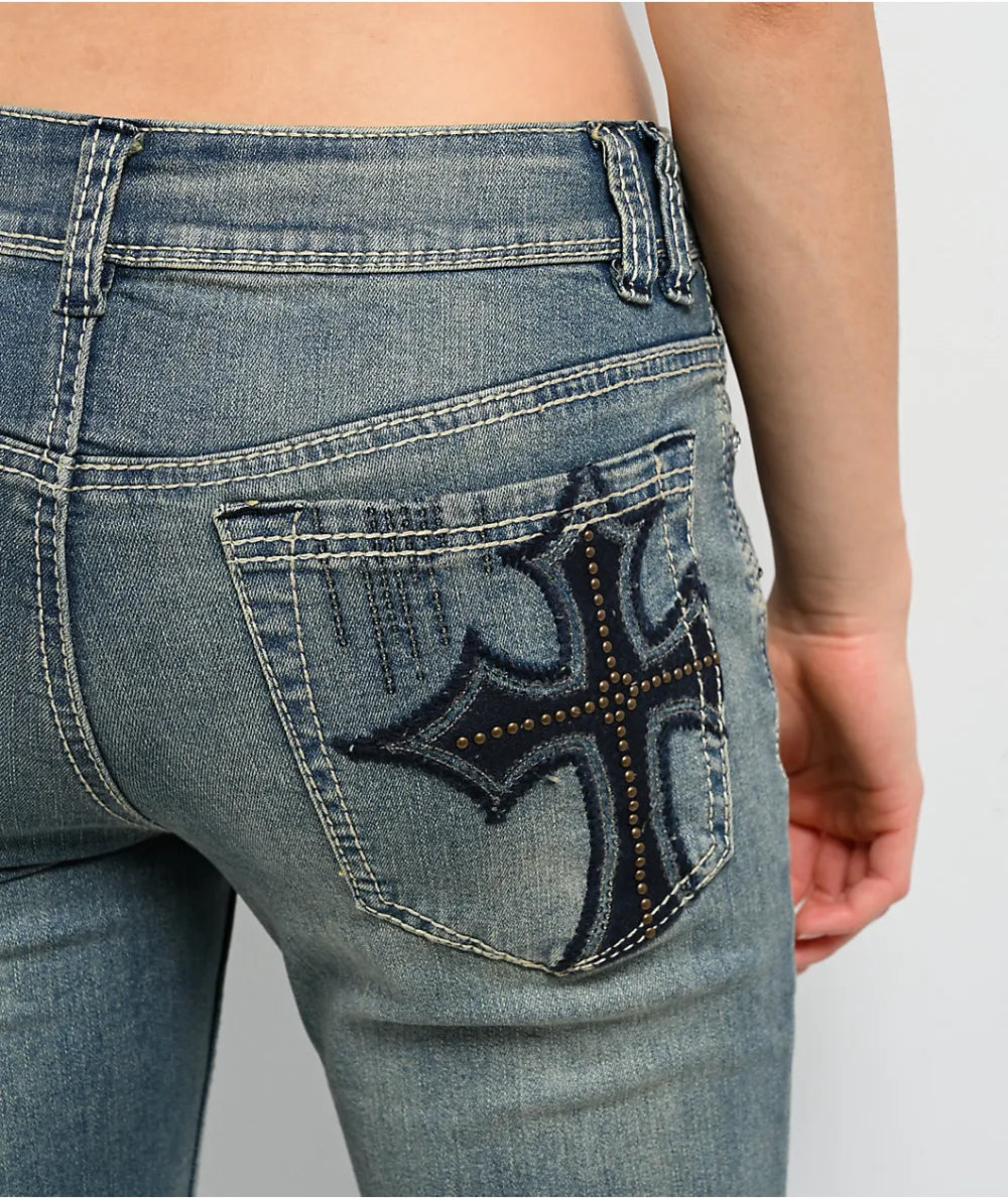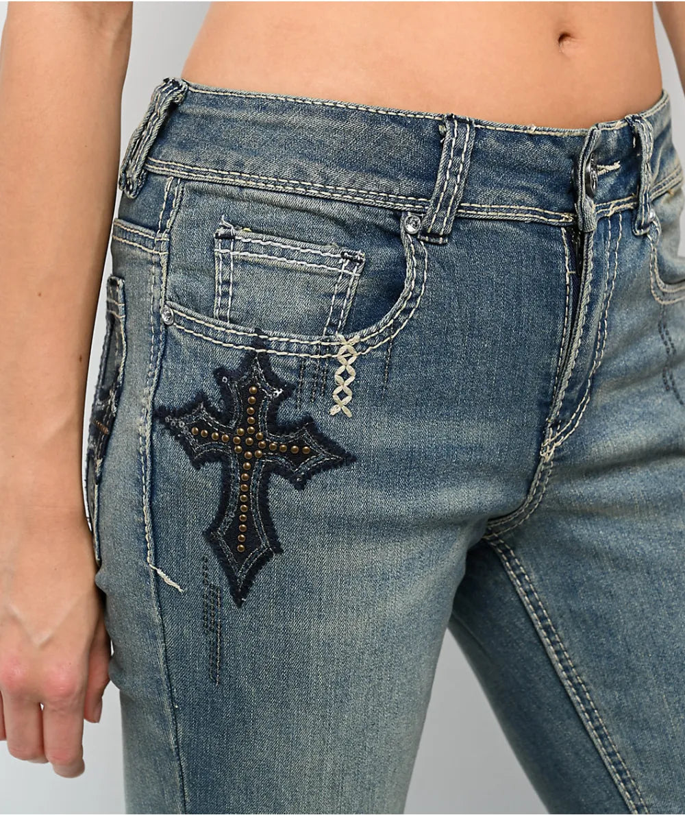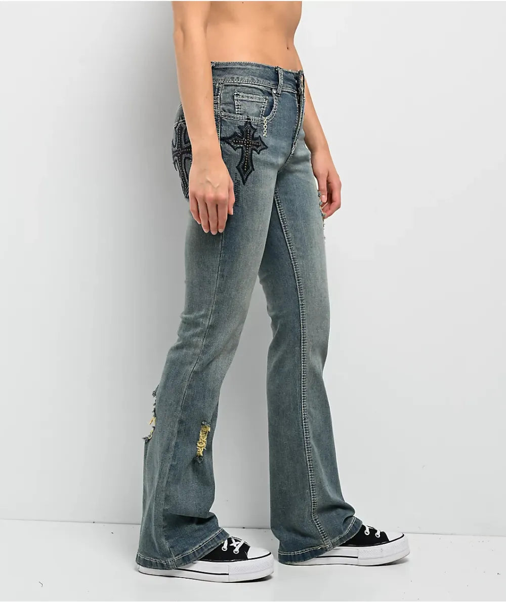 Add grunge flair to any outfit with the Alyssia Sequins bootcut jeans from Ninth Hall, arriving in a Drizzle light blue wash. The denim pants have distressed detailing throughout, as well as sequin and stud-adorned crosses on the front and back for throwback style. A mid rise waist and flare cut give the blue jeans a Y2K silhouette.
